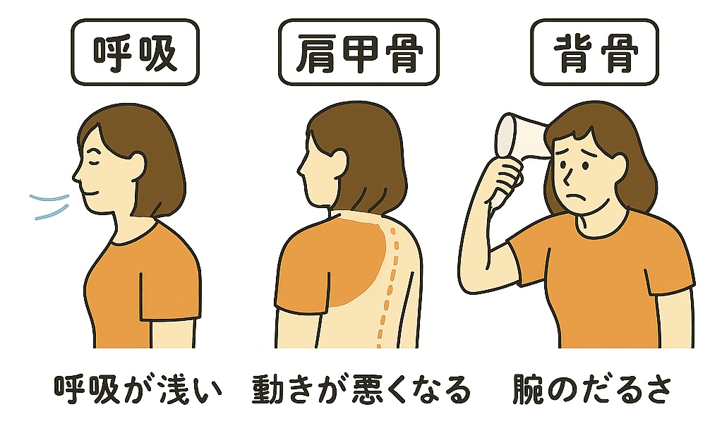 呼吸が浅いことで肩や背中が緊張し、