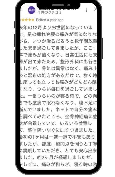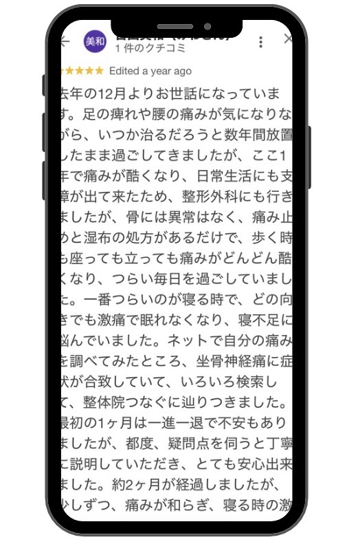 足の連れや腰の痛みが気になりながら、いつか治るだろうと数年間放置したまま過ごしてきましたが、ここ1年で痛みが酷くなり、日常生活にも支障が出て来たため、整形外科にも行きましたが、骨には異常はなく、痛み止めと湿布の処方があるだけで、歩く時も座っても立っても痛みがどんどん酷くなり、つらい毎日を過ごしていました。一番つらいのが寝る時で、どの向きでも激痛で眠れなくなり、寝不足に悩んでいました。ネットで自分の痛みを調べてみたところ、坐骨神経痛に症状が合致していて、いろいろ検索して、整体院つなぐに辿りつきました。院長からのコメント