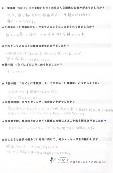 ギックリ腰で動くたびに激痛が走り安静にしてる時でも痛くて辛かった。