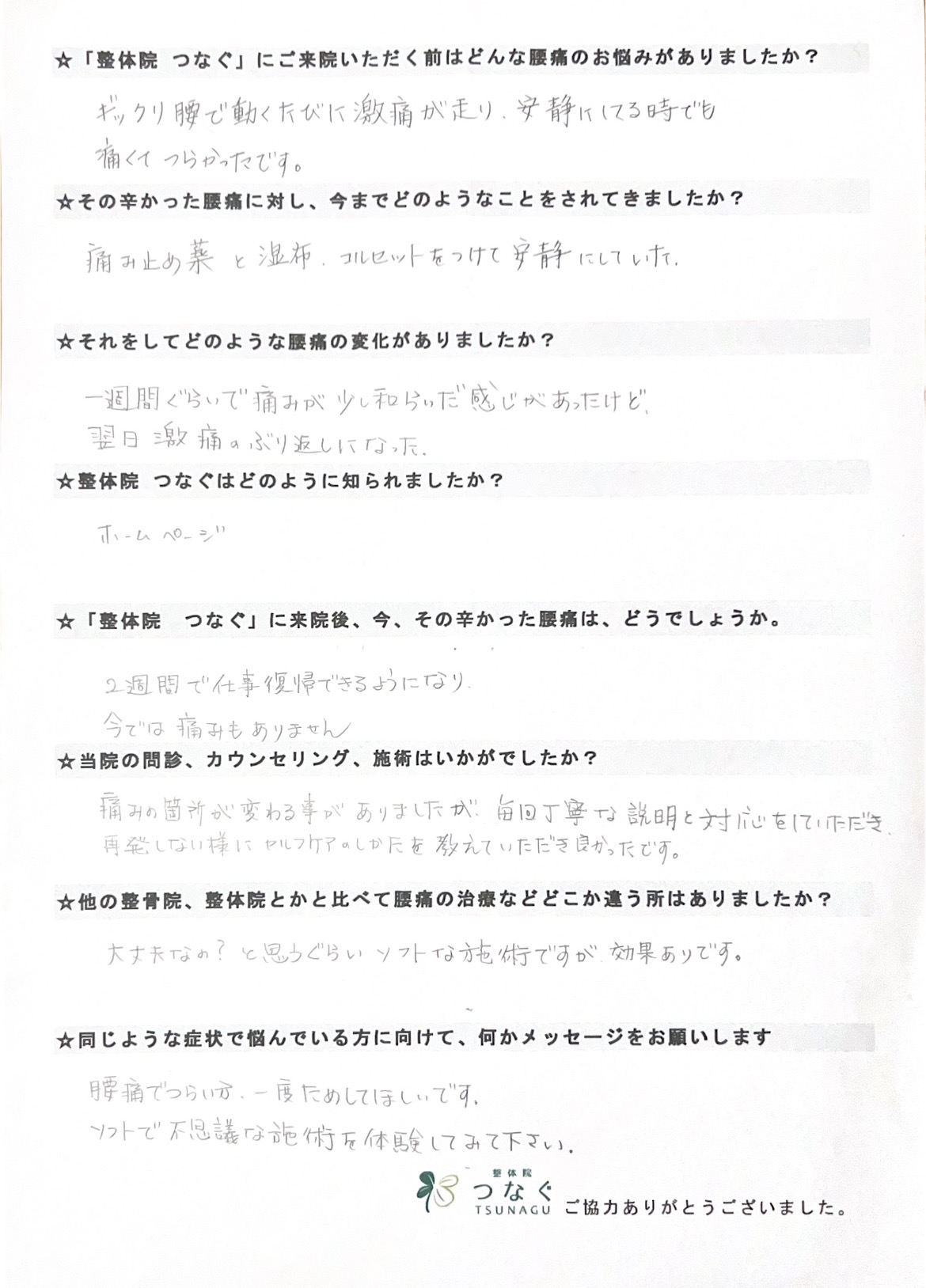 痛みの箇所が変わることがありましたが、毎回丁寧な説明と対応をしていただき、再発しないようにセルフケアを教えていただきよかったです。